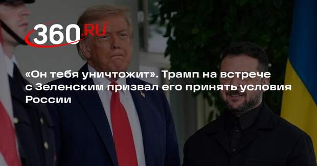 Президент США Дональд Трамп во время встречи с украинским лидером Владимиром Зеленским в Белом доме потребовал согласиться на условия Москвы, предупредив, что в противном случае Россия «уничтожит» Украину. Об этом сообщила Financial Times со ссылкой на источники, знакомые с ходом переговоров. Разговор на повышенных тонах По данным издания, встреча прошла в напряженной обстановке и неоднократно переходила в перепалку.