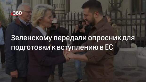 Глава Еврокомиссии (ЕК) Урсула фон дер Ляйен передала президенту Украины Владимиру Зеленскому опросник, который позволит ЕК рекомендовать Совету Евросоюза начать обсуждение вопроса о начале переговоров о вступлении страны в ЕС. Она пообещала «помочь заполнить его не в течение лет, а в течение недель». Об этом сообщил ТАСС. «Вопросник должен быть заполнен, это вопросы для [вынесения] формальной позиции в качестве рекомендации Европейскому союзу. Мы готовы 24 часа семь дней в неделю помочь вам заполнить этот вопросник. Поэтому сформулировать эту позицию можно будет не как обычно в течение лет, а в течение недель, если мы будем тесно работать вместе» — сказала она. Фон дер Ляйен также добавила, что Еврокомиссия хорошо знает Украину и это позволит ускорить подготовку позиции ЕК. При этом она не сообщила прямо, когда именно Украина может претендовать на вступление в ЕС, но выразила надежду, что Евросоюз «будет работать вместе с Украиной, чтобы восстановить Украину, что означает массированные инвестиции и реформы, и это позволит проложить путь к вступлению Украины в ЕС». Рекомендация Еврокомиссии Совету ЕС о начале переговоров о приеме в сообщество является первым шагом на пути вступления в союз.
