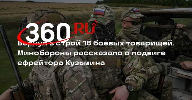 Ефрейтор Константин Кузьмин в составе медицинской группы вернул в строй 18 бойцов. Информацию от Минобороны опубликовало РИА «Новости». По данным оборонного ведомства, ефрейтор Кузьмин неоднократно под минометным огнем противника вытаскивал с поля боя раненых товарищей, перевозил их в безопасное место и оказывал медицинскую помощь, поддерживая жизнь до эвакуации.