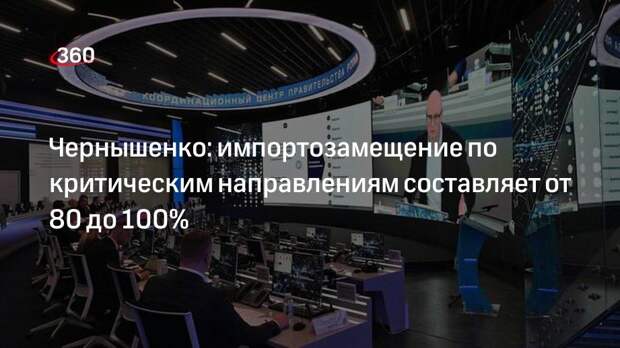 Импортозамещение по всем критическим направлениям находится на высоком уровне. Об этом заявил заместитель председателя Правительства Российской Федерации по вопросам цифровой экономики и инновациям Дмитрий Чернышенко. Он заявил об этом во время встречи кабинета министров с представителями IT-отрасли. Трансляция доступна на официальном RuTube-канале Правительства России. «У нас, конечно, есть свои сервисы для импортозамещения. По всем критическим направлениям у нас уровень импортозамещенности [составляет] от 80 до 100%», — отметил он. Также Чернышенко отметил, что часть российских сервисов пока не может сравниться с западными аналогами. Зарубежных конкурентов российских разработок он назвал «технологическими гигантами». «Сейчас тот самый момент, когда мы должны ускоренным образом улучшить и сделать наши конкурентоспособные аналоги всех крупнейших мировых игроков», — подчеркнул Чернышенко.
